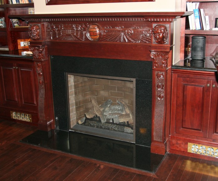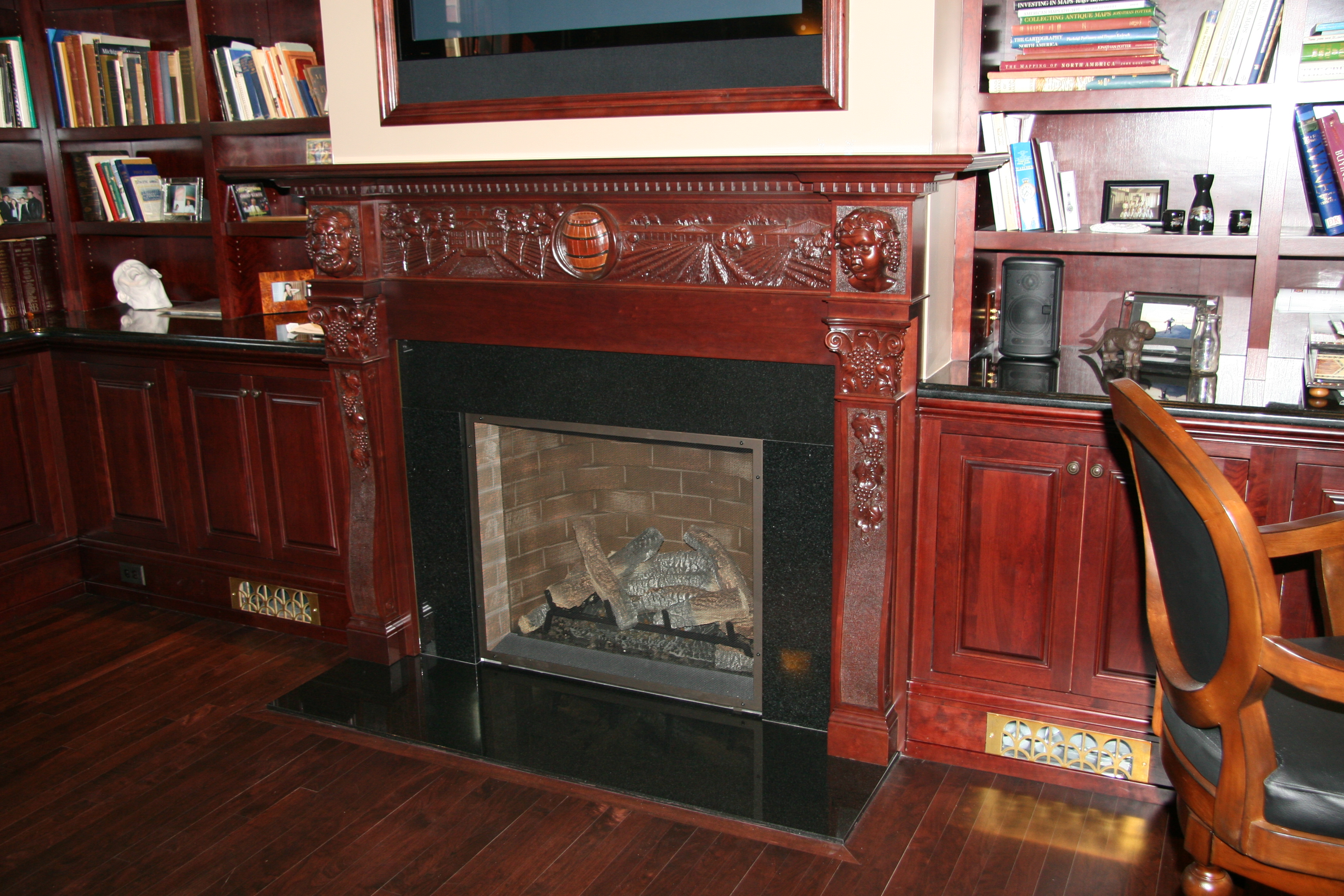 A custom carved mantel and fireplace surround was carefully designed to reflect the vineyards of Bacchus, young and old, and his vineyards, freshly planted and thriving. The wine god of ancient Greece is surrounded by bursting vines of ripe grapes and the focal point showcases a nearly 3D barrel, ready for tapping.