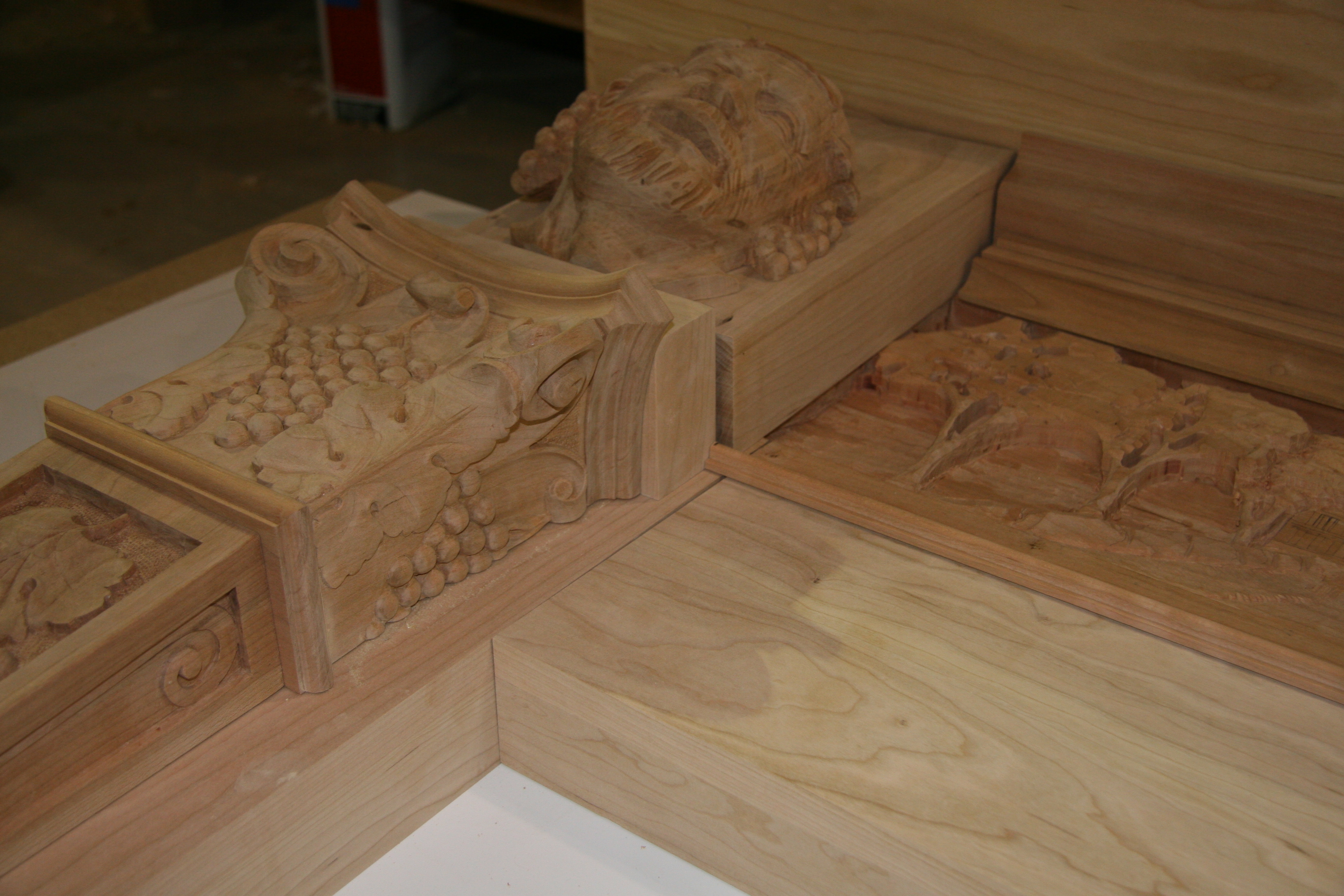 Meticulous patterns for the wood carvers were created through numerous hand sketches and later, AutoCad. Three species of wood were used to accentuate the details, which included the owner’s company emblem of a large “O” as the focal point encasing a wine barrel. The success of the lengthy project was evident in the eyes of the owner and carvers alike.